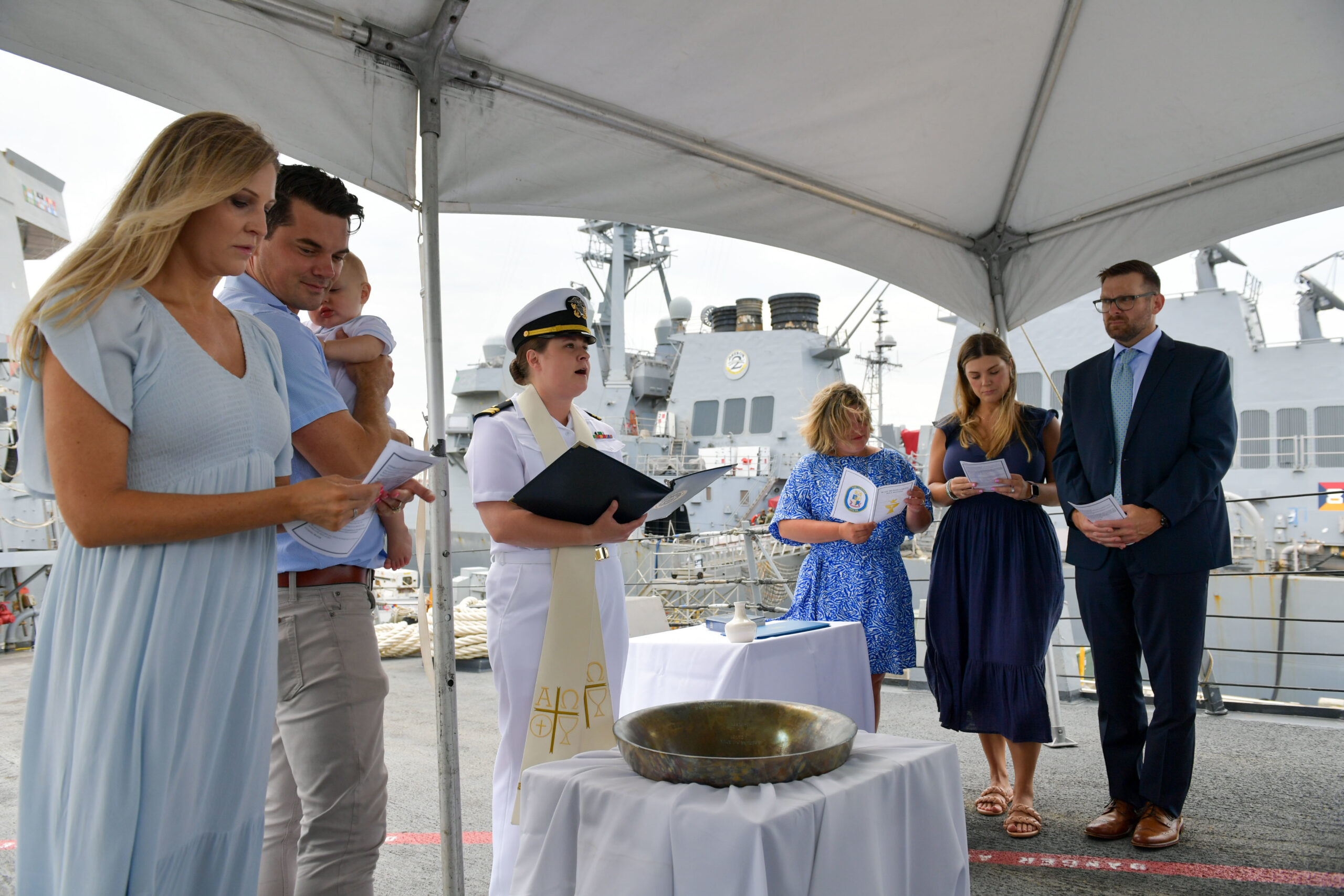 The U.S. Navy places great emphasis on its culture and traditions. One such tradition is the bell baptism, which traces its roots back to the British Royal Navy. When a ship was underway or in a foreign port and a baptism had to be performed, the infant or child was baptized onboard using the ship’s bell. Following the baptism, the child’s name was engraved on the ship’s bell and remained until the ship was decommissioned. The tradition persists in the modern U.S. Navy, including one ship that hosted the baptism for two of its namesake’s descendants.