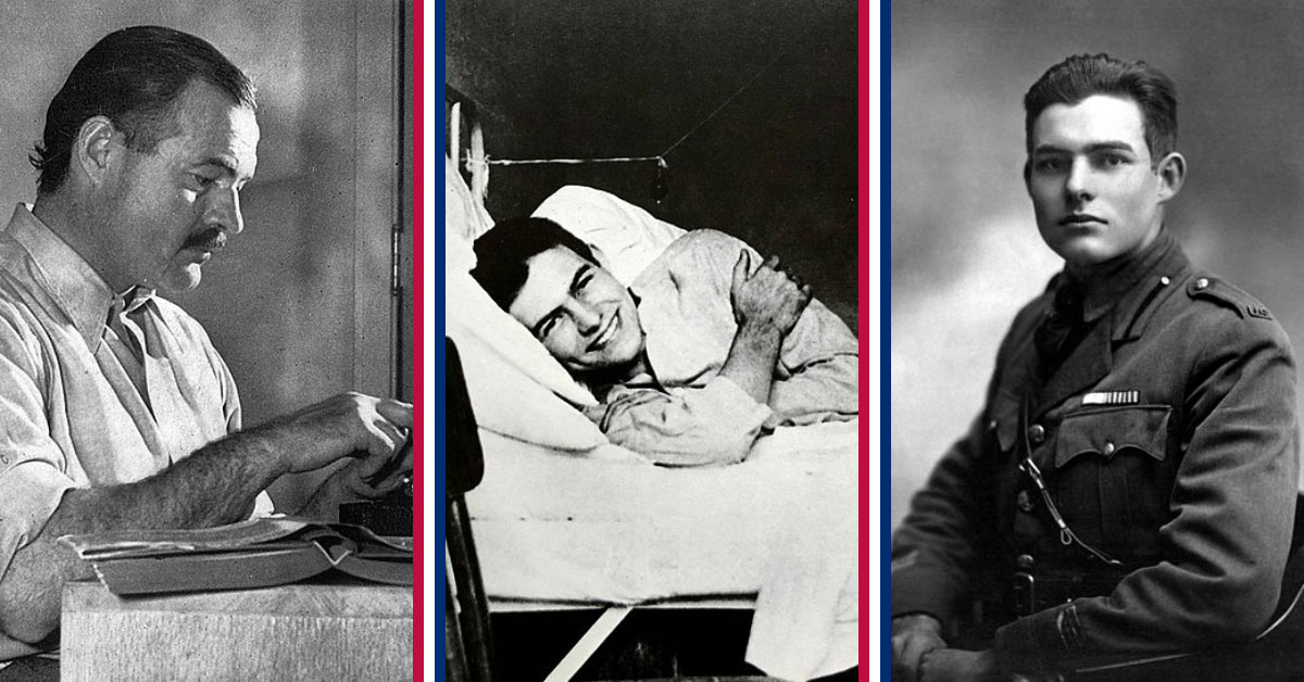 Featured Image: (Left) Hemingway working on his book For Whom the Bell Tolls at the Sun Valley Lodge, Idaho, in December 1939; (Middle) Hemingway in American Red Cross Hospital, July 1918; (Right) Hemingway in uniform in Milan, 1918.