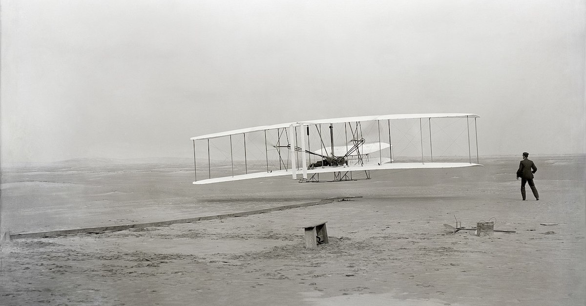 After years of tests and engineering designs, the Wright brothers were ready to test their aircraft. They transported it in pieces to Kitty Hawk, North Carolina, a perfect location with steady winds and soft sandy dunes. On Dec. 14, after tossing a coin to determine who would make the first attempt, Wilbur climbed into the pilot’s position, but the flyer stalled before takeoff and crashed.