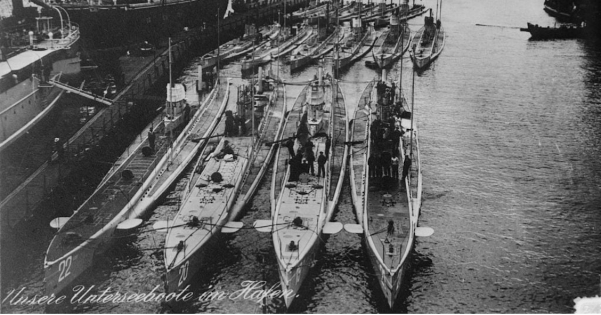 Featured Image: German U-boats in Kiel. U-20, which sank the Lusitania, is second from the left in the front row. (Library of Congress photo)