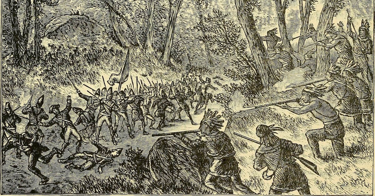 Featured Image: British forces under fire from the French and Indian forces at Monongahela, when the Braddock expedition failed to take Fort Duquesne.