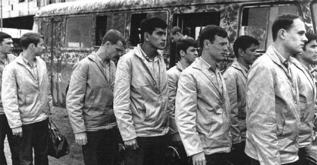 Featured Image: POWs lined up for release on March 27, 1973 at the airport. Marines pictured among the 27 returnees freed that day were Sgt Jose J. Anzaldua, fourth from the left, and Sgt Dennis A. Tellier, second from the right. The bus was camouflaged to defend against a potential air attack.
