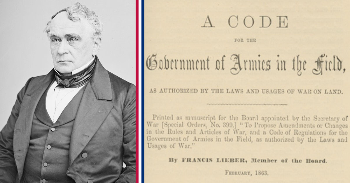 The Lieber Code was prepared by international lawyer Franz Lieber, who emigrated from Germany to the United States after being imprisoned as an “enemy of the state” due to his liberal nationalist views. In the United States, he became a professor of political science at the University of South Carolina, where he soon began to feel like an outsider due to his opposition to slavery. He moved to New York to teach at Columbia University and Columbia Law School, where he lectured on constitutional questions relating to times of war.
