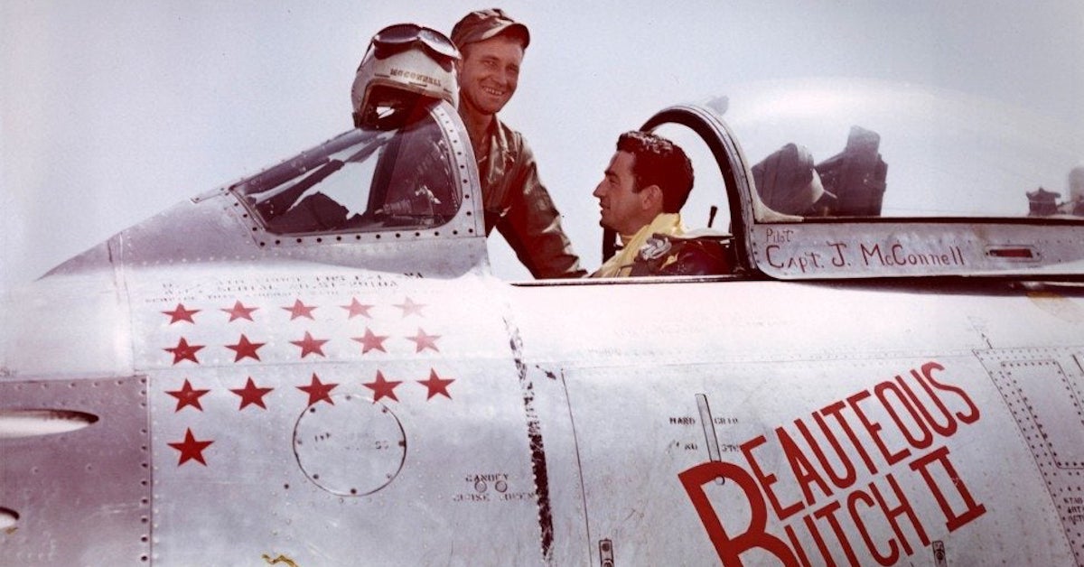 While an “ace” is a pilot from any branch who has shot down five or more enemy aircraft, the top jet ace in USAF history is Joseph C. McConnell, a “Triple Ace” who shot down 16 MiG fighters during the Korean War over a four month period, bagging three on his last combat mission of the war. His American record still stands.