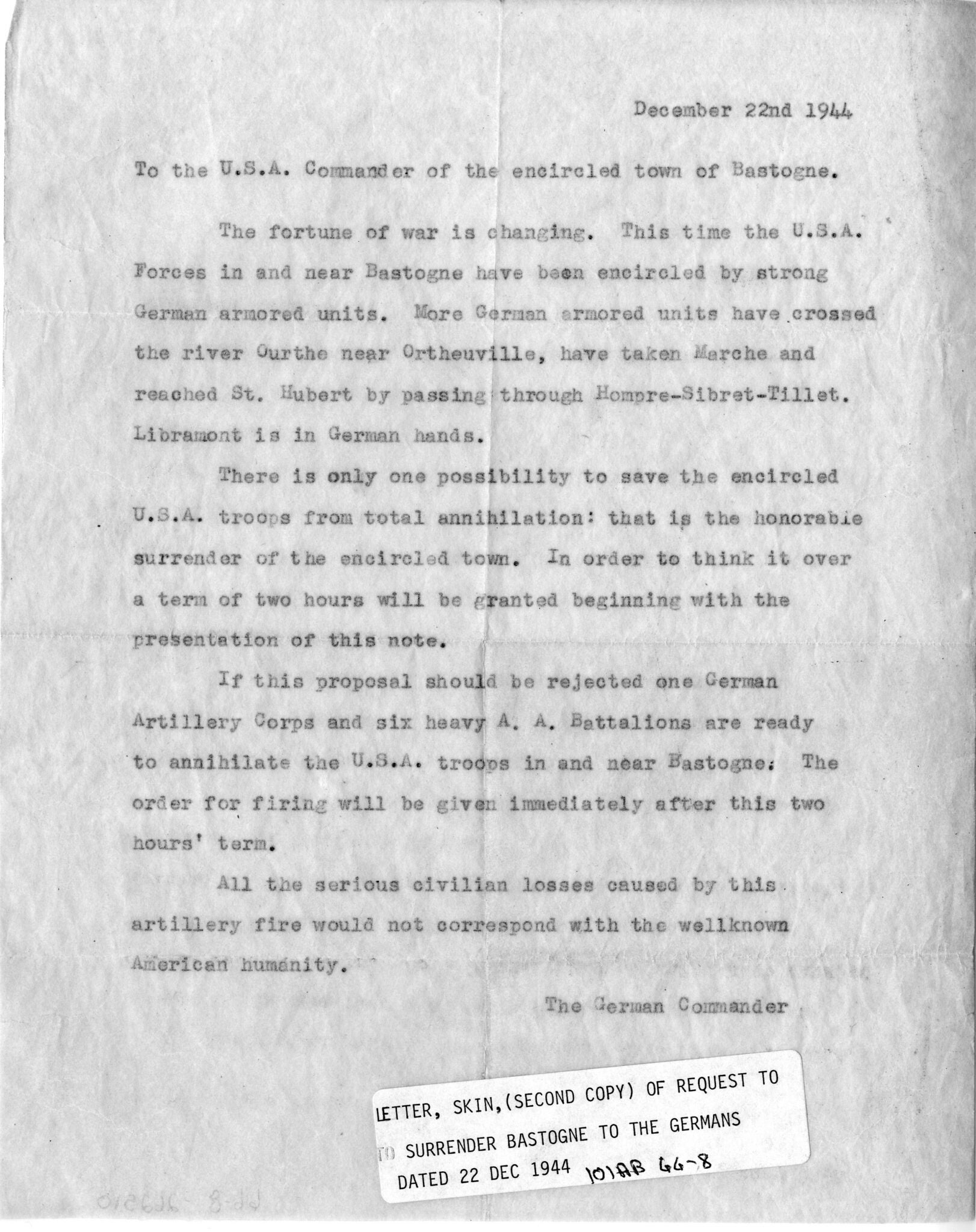 On Dec. 22, a group of four German soldiers approached under two white flags and demanded to deliver a written message.