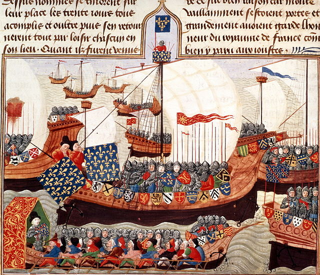Featured image: Mahdian Crusade 1390: The Crusade-fleet with her leader, the Duke of Bourbon, and the Oriflamme. (British Library, Harley 4379 f. 60v)