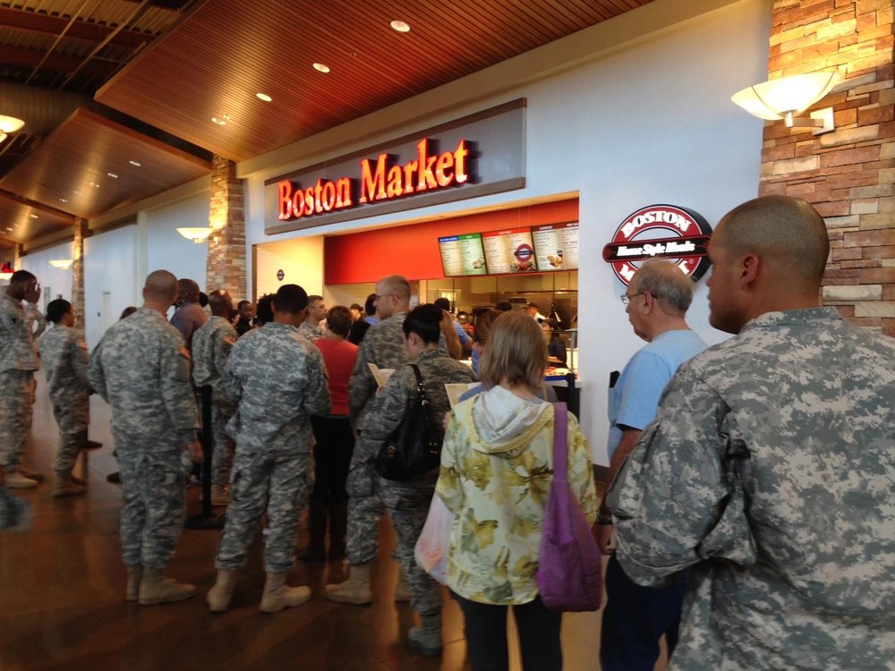 Someone’s got to take one for the team. Fort Bragg’s food court is the most okayest of the top five. After lacing up your jump boots and flying high you land at the food court with the most predictable fast food options of all military installations. The Fort Bragg Exchange offers burgers, cold cuts and cheese fries, and the seasoned service member’s favorite: rotisserie chicken, green beans and cornbread. Go ahead and wash it down with a warm sweet tea. Yum.
