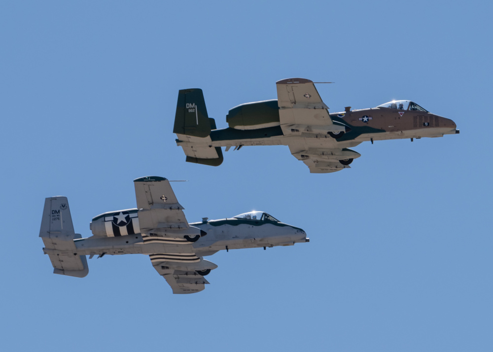 At the 2021 Heritage Flight Training Conference, both demo Warthogs flew together in a rare dual formation. The conference is an annual event to certify new Air Combat Command single-ship demonstration team pilots. Additionally, it allows them to practice formation flying alongside historic military aircraft. The demo Warthogs flew with an A-1H Skyraider, another close air support legend that flew extensively during Korea and Vietnam.
