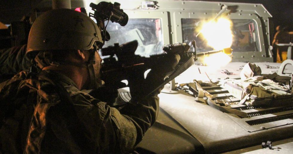 A soldier fires blank rounds at a rotational training unit during an exercise at the Joint Readiness Training Center in Fort Polk, La., April 22, 2014. (Photo: U.S. Army Staff Sgt. Christopher Klutts)