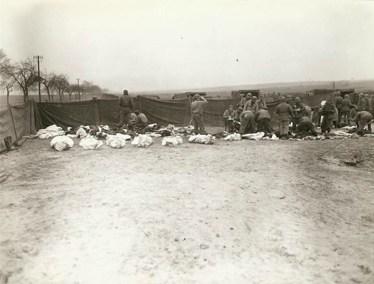 Dead American and German soldiers at a cemetery before burial, place unknown. Each body is placed in a mattress cover. German prisoners are doing the work of digging the graves and placing the bodies in them. (#P04)