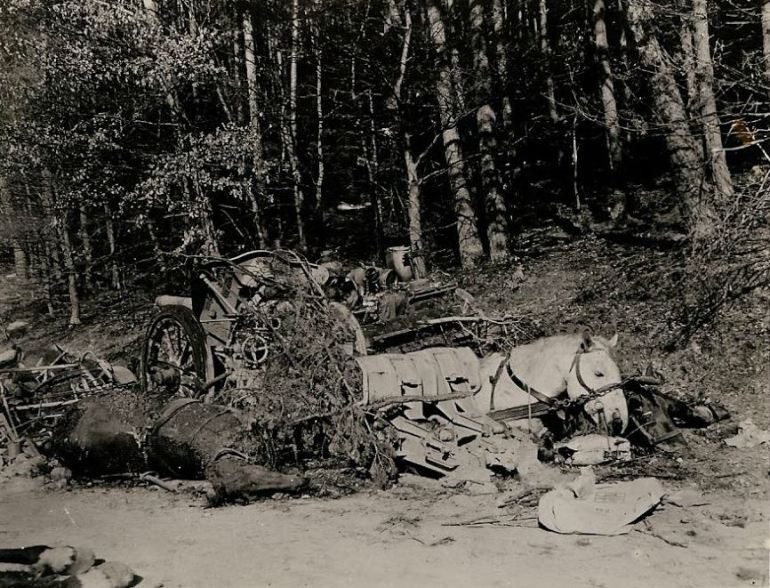 Dead horses and wrecked vehicles equipment of a German convoy are strewn along the road in the vicinity of Lug, Germany, following an attack from U.S. artillery. The Germans were trying to escape encirclement by 3rd and 7th Armies. (#P08)