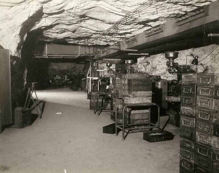 A German underground ball-bearing factory in Germany, where all size bearings were made. Shown is a row of polishing and grinding machines used to finish the bearings. This might be in Schweinfurt? (#P09)