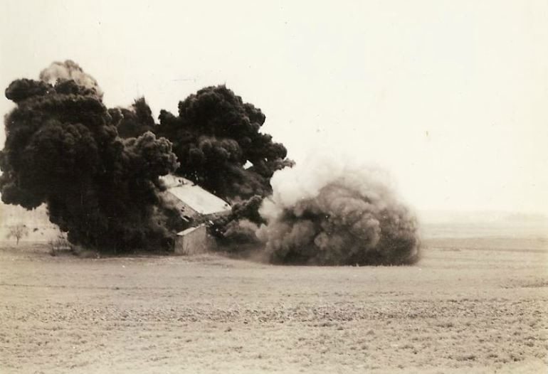 English M-5 Anti-tank mines are used to blow up German pill boxes. 400 lbs of TNT are being set off inside the pill box. (#P11)