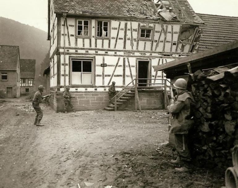 Seventh Army men looking for snipers in the Bobenthal, Germany. (#P14)