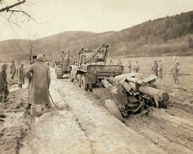 When this wrecker towing a 155mm Howitzer became stuck in the mud in a road, nothing less than a bulldozer could budge it. (#P15)