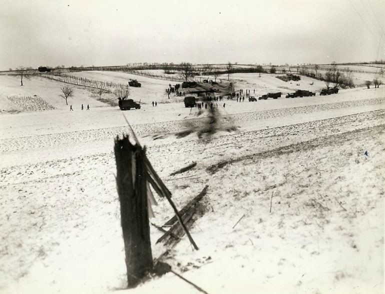 Path of a B-17 as it crash-landed into a snow covered field on the Seventh Army front. Pilot escaped with minor cuts when he rode the plane in after the crew bailed out. Note: The pole in foreground was clipped by the plane as it came in. (#P16)