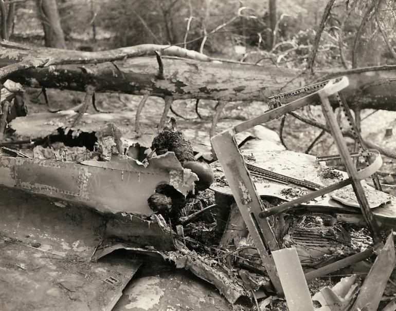 Charred remains of a German pilot, the plane was brought down by small arms fire on March 15, first day of Seventh Army offensive in Germany. – Interesting note, thanks to this forum, the plane was I.D. and it turns out that it is most likely an U.S. P-47! (#P19)