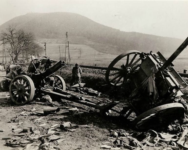 U.S. soldier standing next to the remains of a German soldier he just discovered near German Howitzers, which were destroyed by the Seventh Army. (#P21)