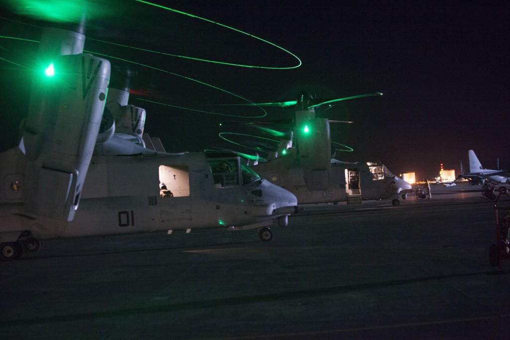 Ospreys with Special-Purpose Marine Air-Ground Task Force Crisis Response prepare to take off in support of a military assisted departure from the U.S. Embassy in Tripoli, Libya, July 26, 2014. Photo: US Marine Corps 1st Lt. Maida Kalic