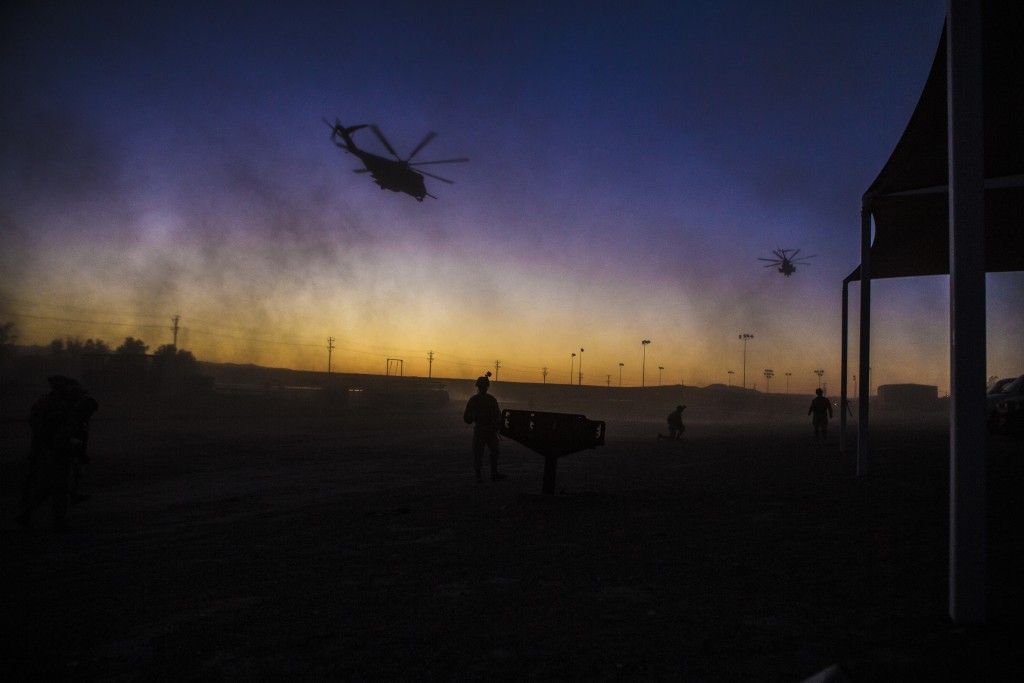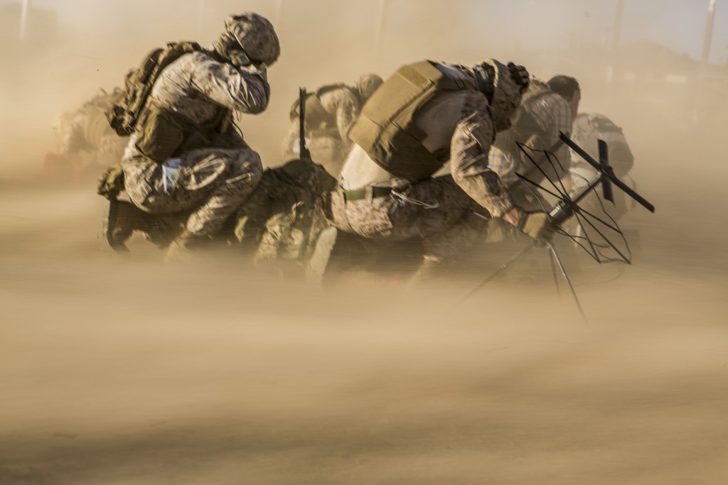 Marines brace themselves against rotor wash from a CH-53E Super Stallion during an embassy evacuation exercise. Photo: US Marine Corps Lance Cpl. Jodson B. Graves Marines provide security during an embassy evacuation exercise. Photo: US Marine Corps Lance Cpl. Jodson B. Graves
