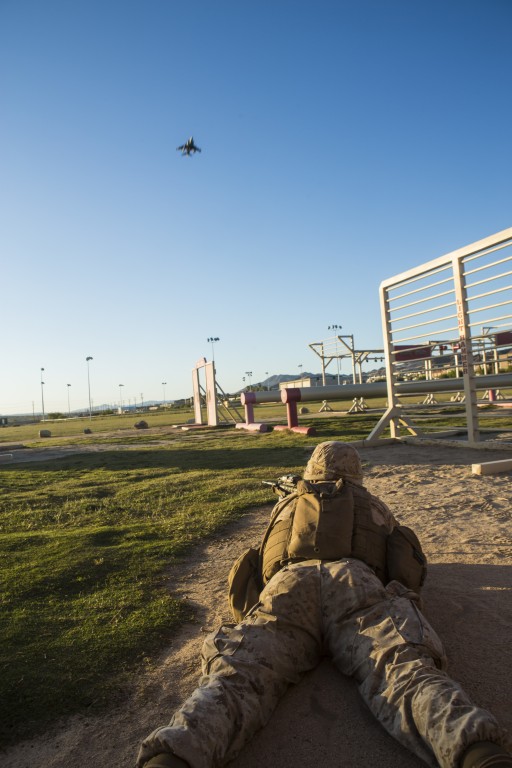 A U.S. Marine provides security during an embassy evacuation exercise while an AV-8B Harrier flies overhead. Photo: US Marine Corps Lance Cpl. Jodson B. Graves