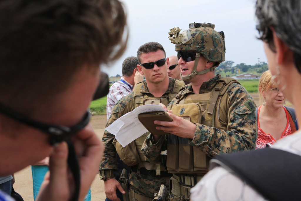 Master Sgt. Robert Gupton, a Marine with Special-Purpose Marine Air-Ground Task Force Crisis Response, accounts for passengers on a manifest at Entebbe, Uganda, after safely evacuating them from the U.S. Embassy in Juba, South Sudan, Jan. 3, 2014. Photo: US Marine Corps Staff. Sgt. Robert L. Fisher III