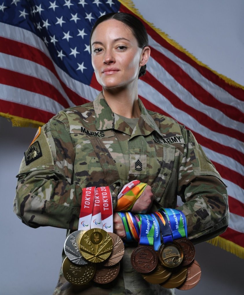 In 2008, Sgt. 1st Class Marks enlisted as a Combat Medic. During a 2010 deployment to Iraq, she suffered bilateral hip injuries that required three operations to restructure them. After treatment in Germany, Marks continued her recovery at Brooks Army Medical Center at Fort Sam Houston, Texas. There, she began swimming for additional physical therapy and cardio with the goal of being deemed fit for duty. Marks achieved this in 2012. This allowed her to join WCAP and swim competitively. In 2016, Marks made her Paralympic debut in Rio where she took home a Bronze medal for the 4x100m medley and a Gold medal for the 100m breaststroke. Marks brought home even more medals from the 2020 Tokyo Paralympics: Bronze for the 50m butterfly, Silver for the 50m freestyle, and Gold for the 100m backstroke. In securing her spot on the 2024 Paralympic Team, Marks set American records in the 50 butterfly S6, 50 freestyle S6, 100 free S6, 100 backstroke S6, and tied her world record in the 100 back. “I expected the competition for a spot on Team USA to be fierce, and we wanted to bring our best and not leave room for doubt,” Marks said in an Army news story. “My coaches, Mason Heibel and Jason Barber, really made it the best environment possible for me to succeed.”