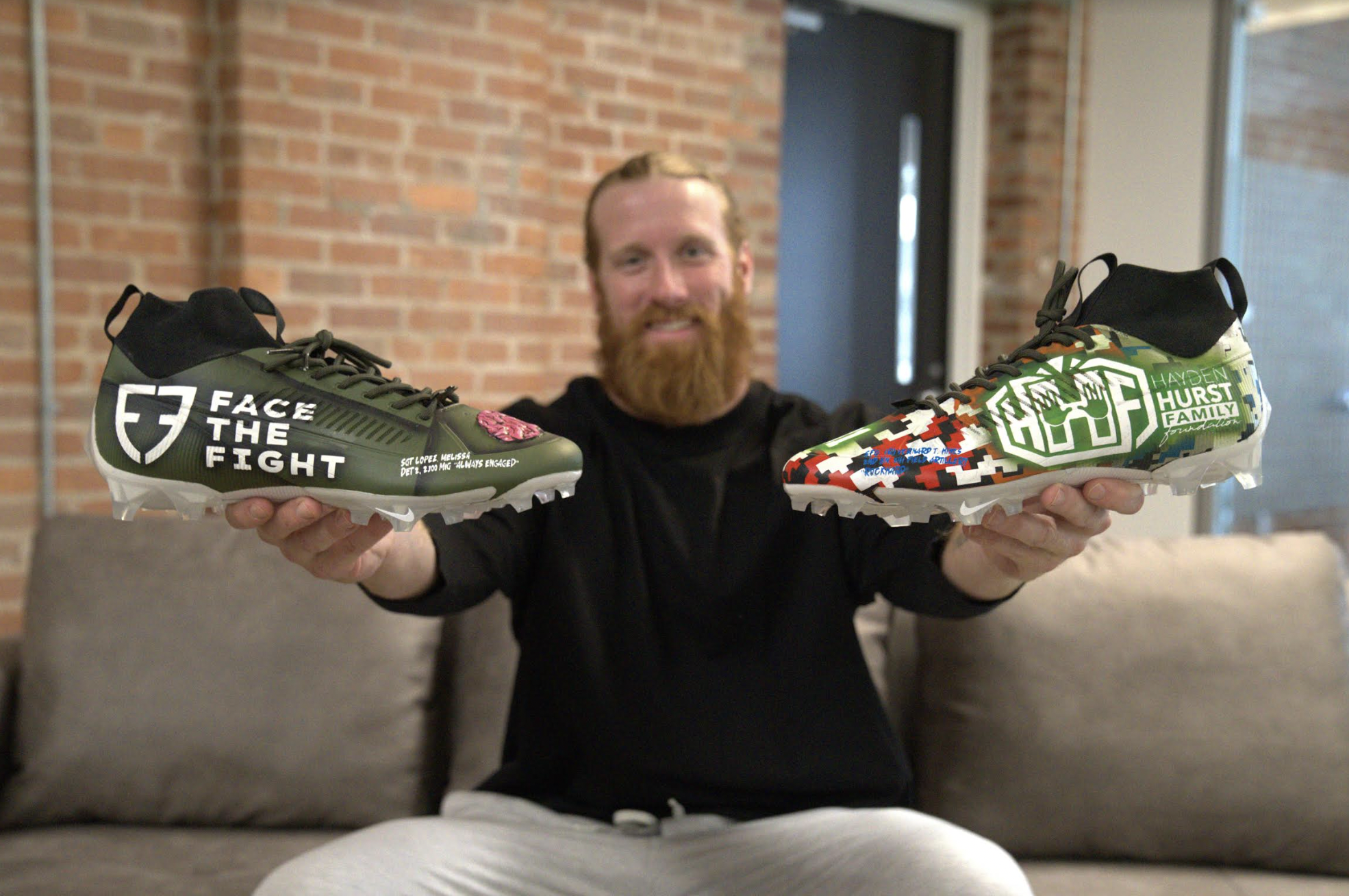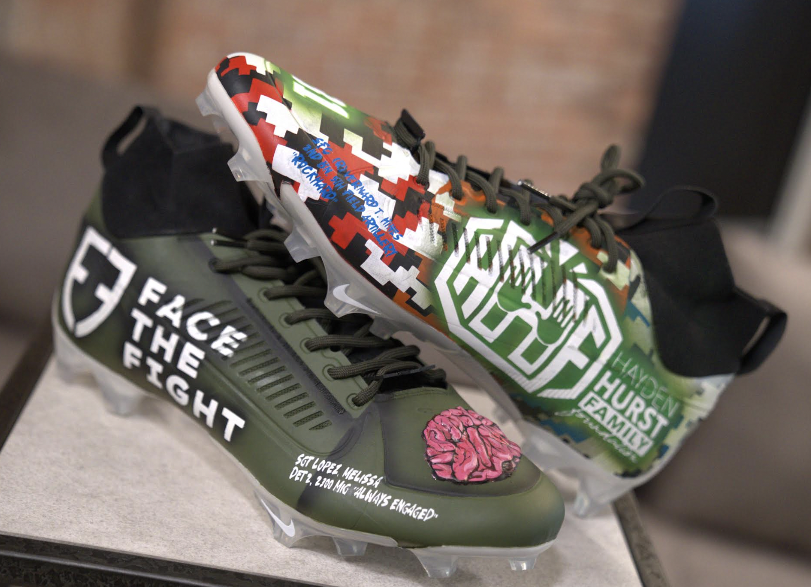- One cleat honors the Hayden Hurst Family Foundation, with dedications to his friends/family