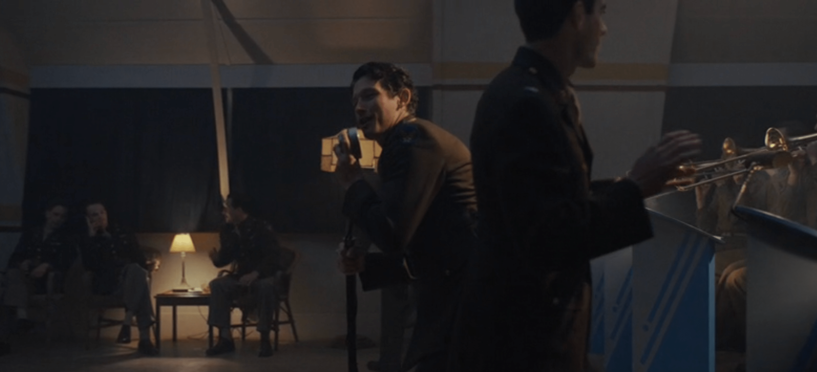 Despite Bucky’s singing, the mood in the dance hall is positive enough for Douglass to break the ice with female Red Cross workers. This highlights the duality of the combat experienced by the Bomber Boys during WWII. In the sky, they were trapped in their planes; forced to endure murderous flak barrages and shredding streams of machine gun and cannon fire. There were no medics aboard the bombers and crewmen could only do so much to help their wounded friends until they got down on the ground…if they got to the ground safely. So, when they did return from a mission, airmen lived it up and partied hard. It was a tough type of war to fight, but luckily the 100th had men like Bucky, Buck and Chick to lead them through.