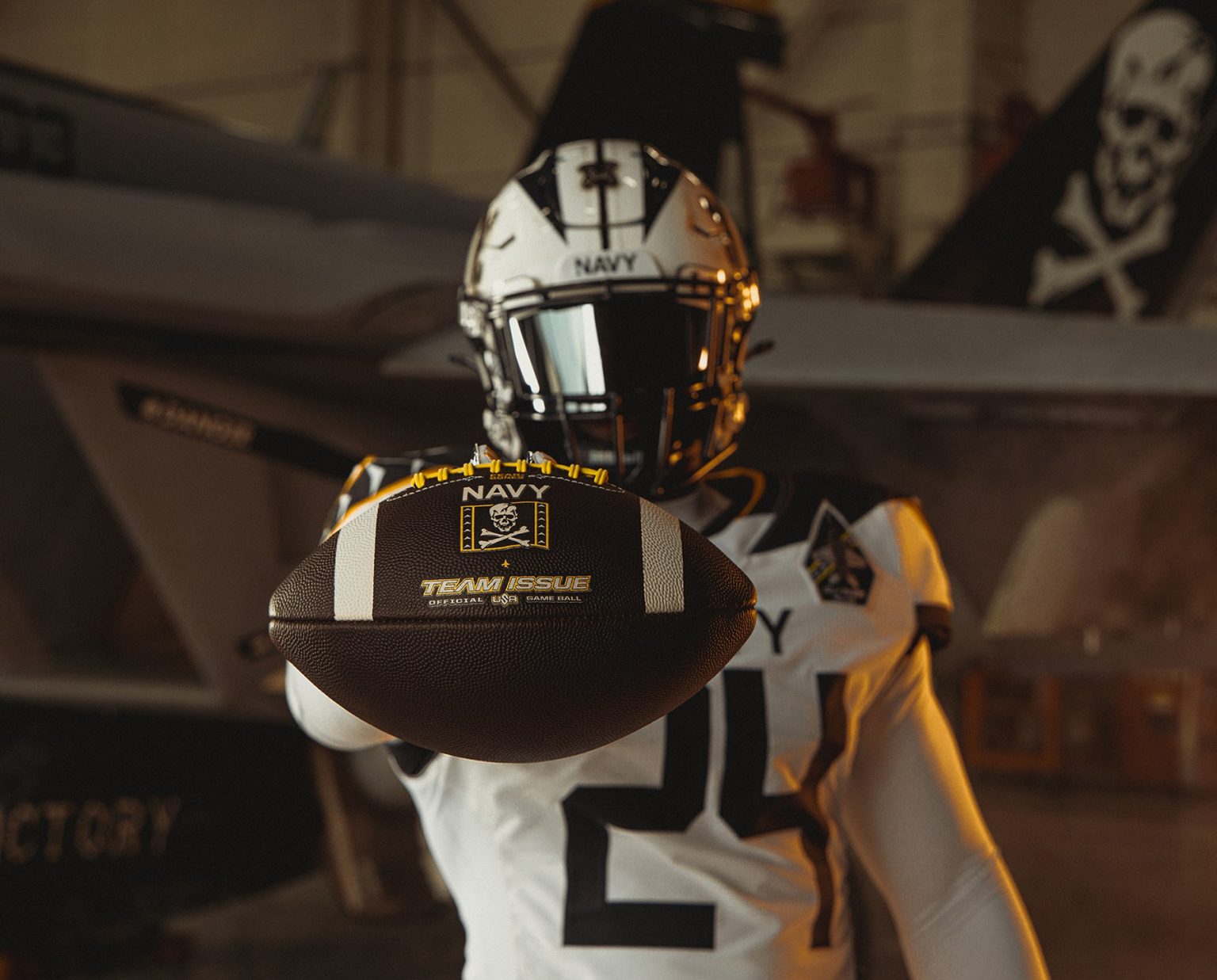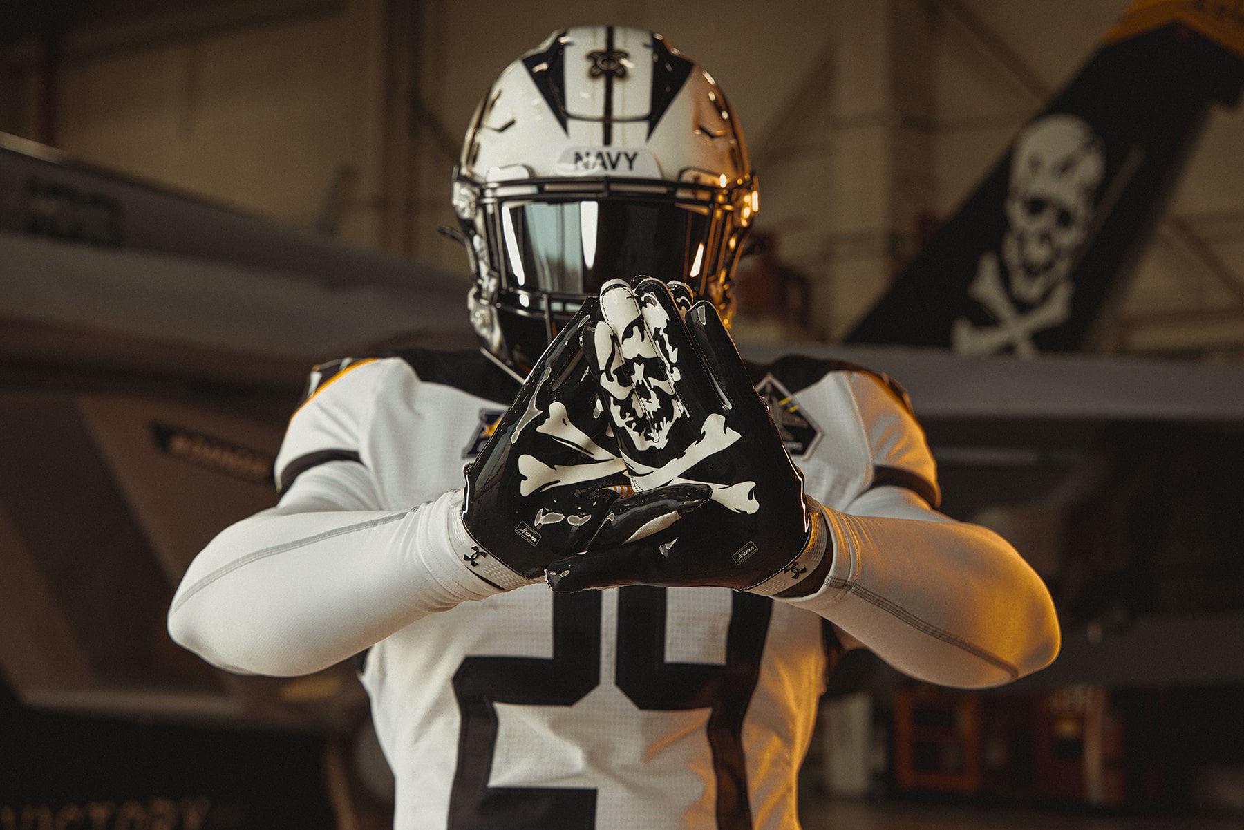 The color scheme of the Navy Football uniform matches that of VFA-103’s Super Hornets. On the cowl, the dark navy color and Skull and Crossbones reflects the twin tails of the Jolly Rogers’ F/A-18s, along with the collar striping which matches the stripe on the aircraft’s tail fin. The uniform numbers model the aircraft side number on the fuselage and the trailing edge flap of the wings, and the Navy marking on the front of the uniform is inspired by the Navy marking on the side of the Super Hornet.