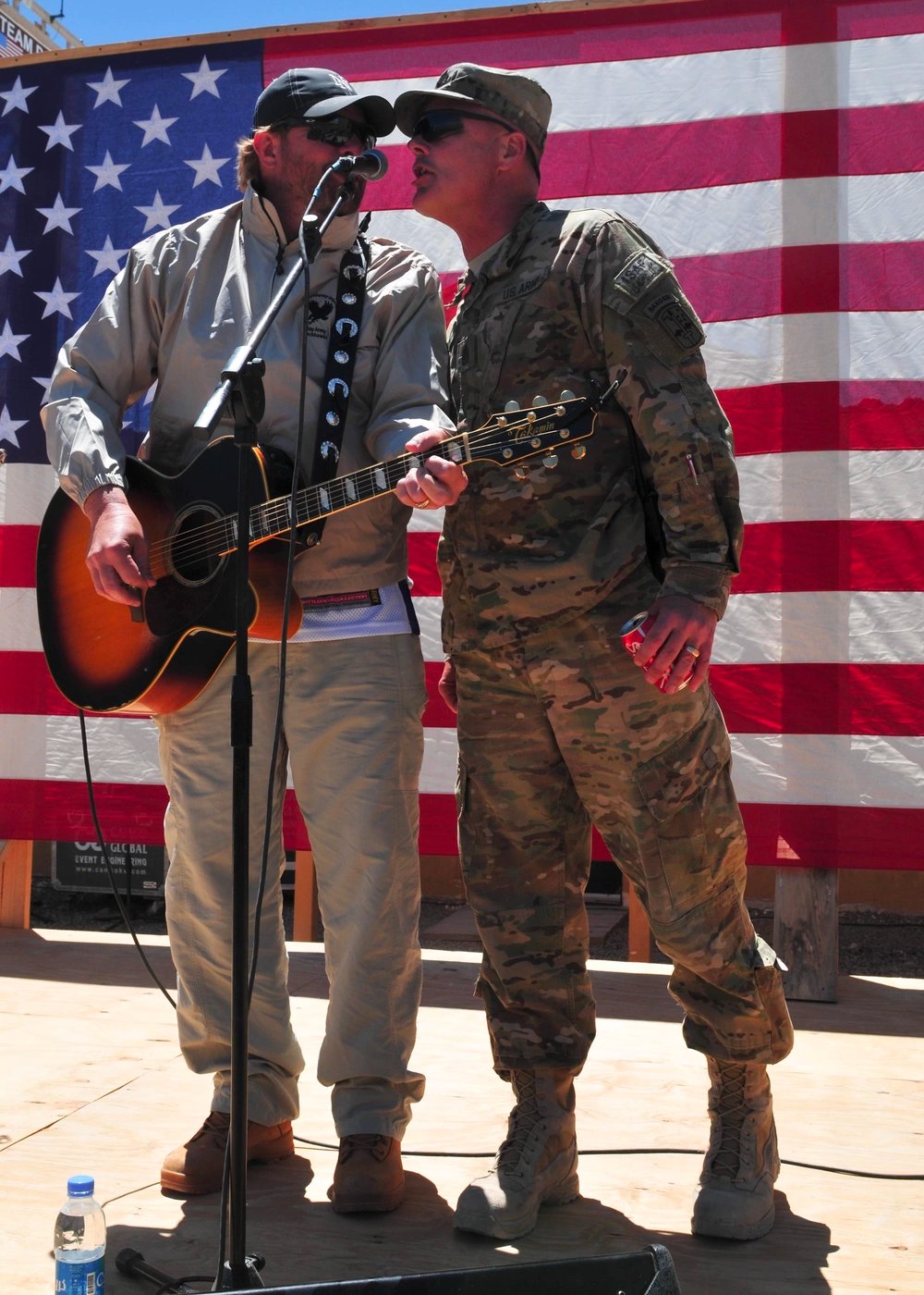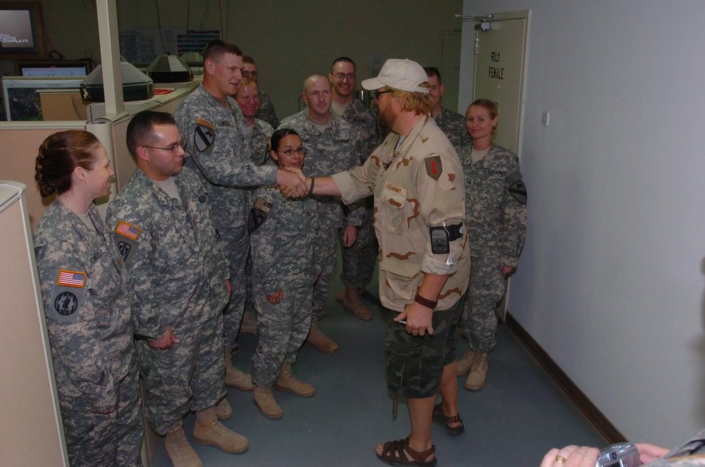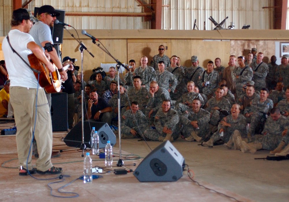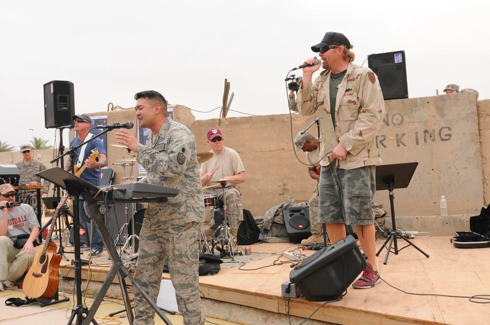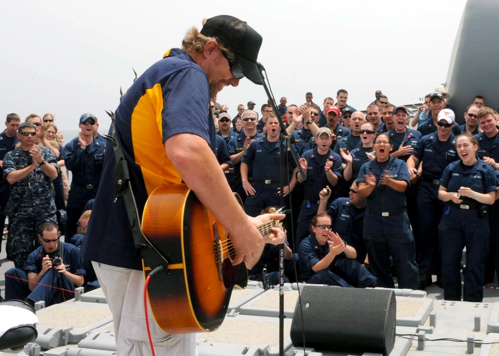 Toby Keith sings one of his ‘bus songs’ to a crowd of Soldiers from the 3rd Heavy Brigade Combat Team, 4th Infantry Division, Task Force Band of Brothers at Forward Operating Base Warhorse (Baqubah, Iraq) May 29, 2006. U.S. Army photo.Crowd cheers for Toby Keith: Hundreds of U.S. Division-North service members and civilians cheer for country music star Toby Keith during Keith’s “Locked and Loaded” tour at Contingency Operating Base Speicher, Iraq, April 27, 2011. Currently on his ninth visit to Iraq, Keith performed a variety of his hits as well as military-themed songs during the USO-sponsored concert. U.S. Army photo.Toby Keith visited Soldiers in the Multi-National Division-Baghdad headquarters at Camp Liberty, Iraq, during his “Big Dog Daddy Tour.” Keith took time to thank Soldiers for their service before performing a concert at Victory Base, an adjacent camp to Liberty. His tour also includes stops in Germany and Afghanistan. U.S. Army photo.Country singer Toby Keith stands in an air gunners hatch of a Stryker Brigade Combat Vehicle. Keith performs for Soldiers and civilians on Forward Operating base Marez, Mosul, Iraq, May 2006. U.S. Army photo.Toby Keith rocks Forward Operating Base Sharana in a surprise concert at the 172nd Infantry Brigade headquarters, April 29. Named one of the top 10 most dangerous places by Maxim Magazine, FOB Sharana and the surrounding combat outposts, are the center of the fight against foreign insurgents trying to infiltrate into Afghanistan. Keith will perform additional concerts in Afghanistan over the following days. U.S. Army photo.Toby Keith takes a moment to pose with service members in PAKTIKA PROVINCE, AFGHANISTAN, 2012. U.S. Army photo.Toby Keith completes his last USO tour with a concert for the troops on Camp Liberty Iraq, April 29, 2011. This is the ninth time Toby Keith has toured Iraq in support of Operation Iraqi Freedom and Operation New Dawn. U.S. Army photo.Country music artist Toby Keith rocks out with members of “MEC” (“Minimum Essential Chords”) – a band that’s made a name for itself here by turning their love for music into a way to relieve deployment stress – as they perform “Takin’ care of Business.” Keith spent a few hours with the deputy commanding general for advising and training staff here during his United Service Organizations-sponsored “Locked And Loaded” tour. Baghdad, Iraq, 2011. U.S. Army photo.Country music star Toby Keith, checks out his new “Balls of the Eagle” t-shirt that was presented to him by Lt. Col. John Dunleavy, commander of 2nd Battalion, 320th Field Artillery Regiment, 1st Brigade Combat Team, 101st Airborne Division (Air Assault), at Logistical Supply Area Anaconda, Iraq, on April 28, 2008. Keith visited the 2-320th FAR to meet with Soldiers and take part in a re-enlistment at the battalion headquarters.Retired Army 1st Lt. Ed Salau holds his prosthetic leg in the air and sings during a Toby Keith concert on Camp Liberty, April 25, 2011. The warriors participated in Operation Proper Exit IX, which assists wounded troops in getting the closure they need in the healing process. U.S. Army photo.Country music entertainer Toby Keith performs an Easter USO concert aboard the guided-missile cruiser USS Leyte Gulf April 24, 2011. Leyte Gulf is conducting maritime security operations in the U.S. 5th Fleet area of responsibility. (U.S. Navy photo by Petty Officer 3rd Class Robert Guerra)