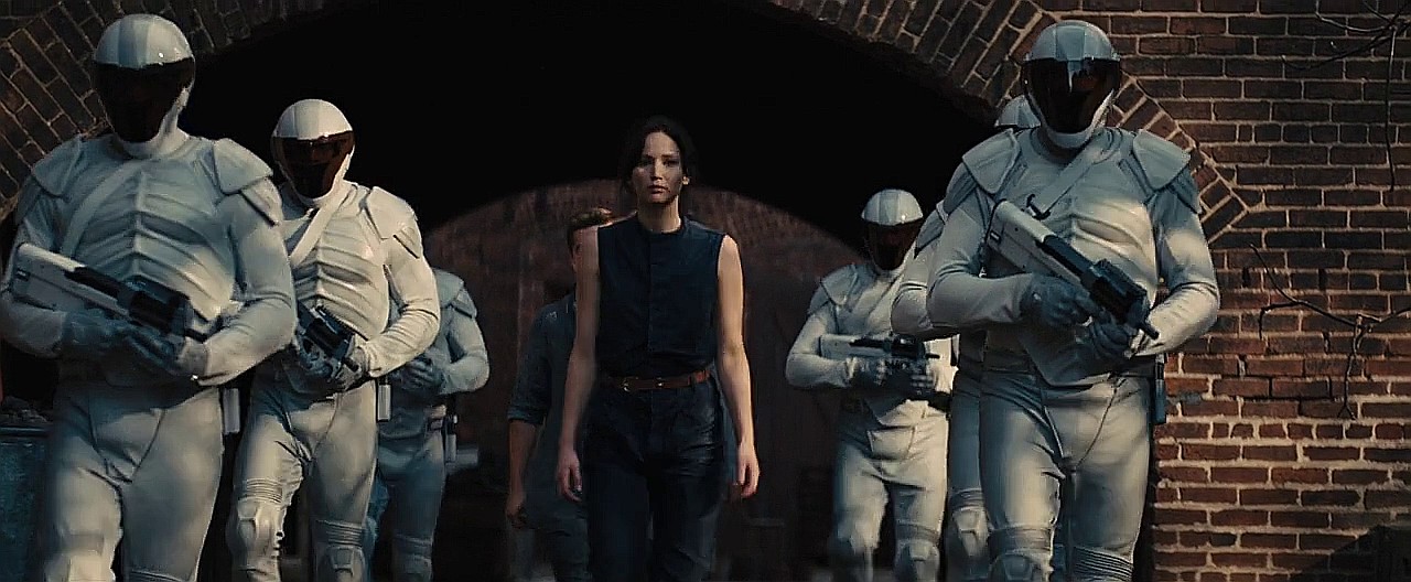 In Mockingjay Part 1, District 8 rebels against the Capitol with the weapons available to them. This includes an M1 carbine carried by rebel leader Commander Paylor and an M14 rifle carried by a child soldier. With wood stocks, these 20th-century weapons reflect the desperation and hardship of the District’s uprising in contrast to the sleek and futuristic bullpups fielded by Peacekeepers. Built by the U.S. and distributed as military aid, these weapons have appeared in third-world conflicts around the globe.