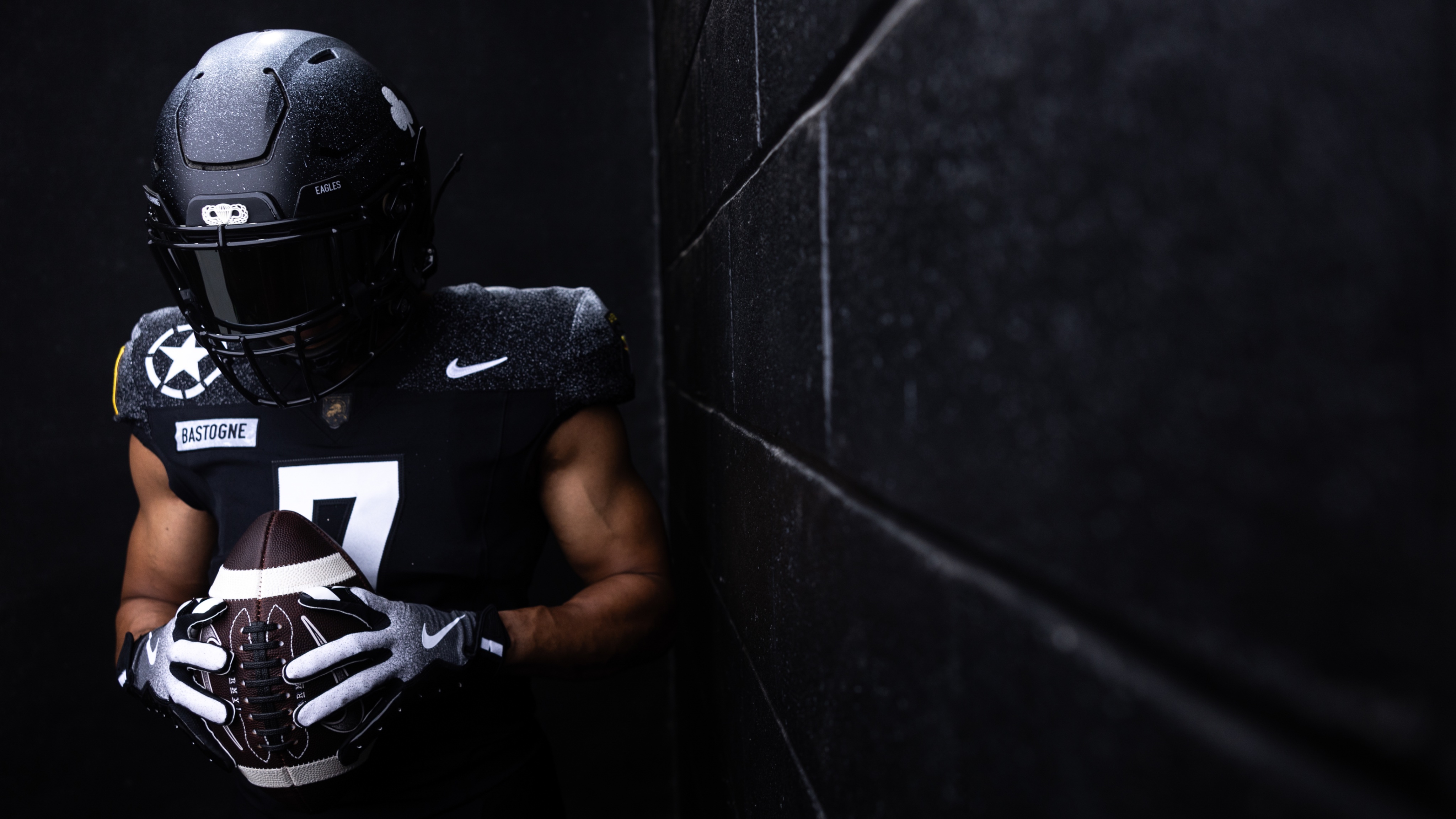 Sticking with the back of the uniform, the back of the jersey features typewriter-style text in reference to Brig. Gen. McAuliffe’s famous response to the German surrender demand. On the front of the jersey, the Army star with a segmented circle and “BASTOGNE” nametape are featured on the right shoulder and breast, respectively. The Army star also appears on the palms of the snow-dusted gloves. Of course, the left shoulder of the jersey proudly displays the Screaming Eagle patch of the 101st Airborne with the American flag featured on the right shoulder. The Army-Navy Game will be played on December 14, 2024, at Northwest Stadium in Landover, Maryland, just outside of Washington, D.C.