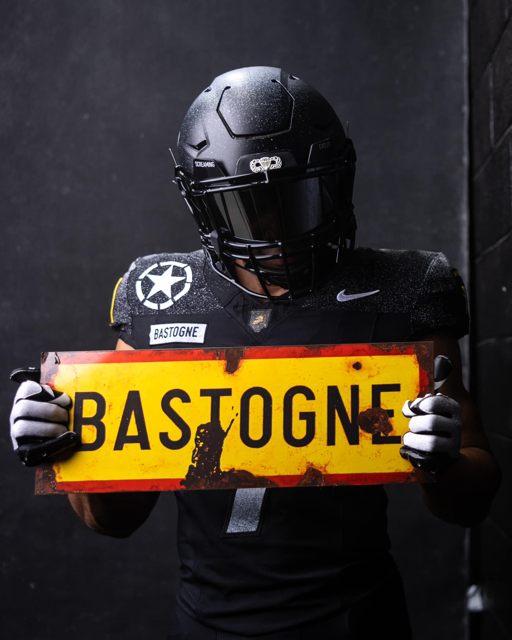 Sticking with the back of the uniform, the back of the jersey features typewriter-style text in reference to Brig. Gen. McAuliffe’s famous response to the German surrender demand. On the front of the jersey, the Army star with a segmented circle and “BASTOGNE” nametape are featured on the right shoulder and breast, respectively. The Army star also appears on the palms of the snow-dusted gloves. Of course, the left shoulder of the jersey proudly displays the Screaming Eagle patch of the 101st Airborne with the American flag featured on the right shoulder. The Army-Navy Game will be played on December 14, 2024, at Northwest Stadium in Landover, Maryland, just outside of Washington, D.C.