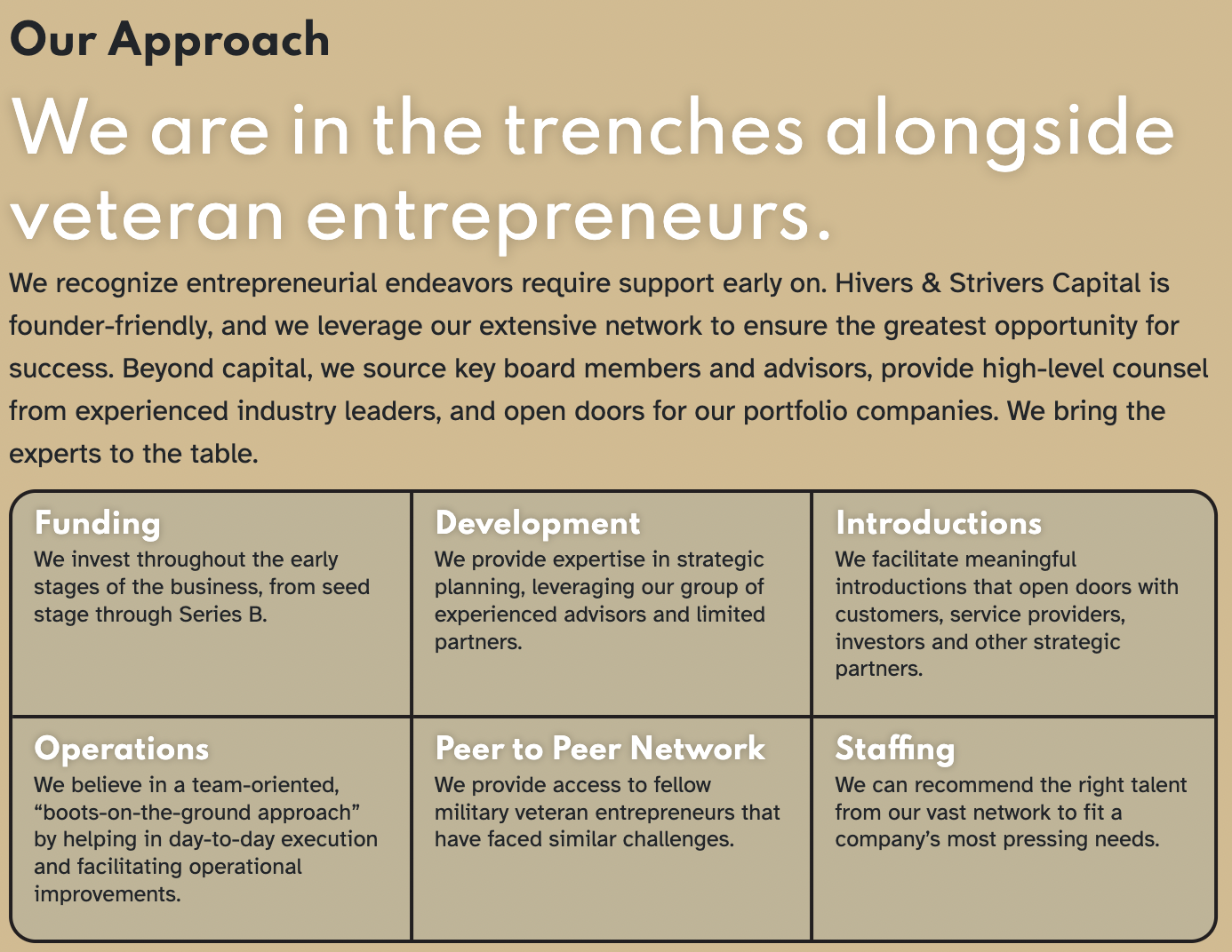 Hivers & Strivers is the most impressive Venture Capital group you’ve never heard of. Since 2010, they’ve quietly invested in over 20 companies, pouring $80 million (yes, million) into start-ups with one crucial caveat: The companies they invest in have to be founded by a U.S. veteran. With six exits, H&S is outperforming other VCs with impressive returns and big numbers. When asked how and why they’re so successful, founder Doug Doan (1979 graduate of West Point and former Army intel officer) says it’s easy: “We don’t invest in companies. We invest in people. Our veteran entrepreneurs are grittier. They’re more focused. They know how to lead a team. Through their military service, they’ve demonstrated they are committed to fulfilling the mission above all else. They don’t quit.”