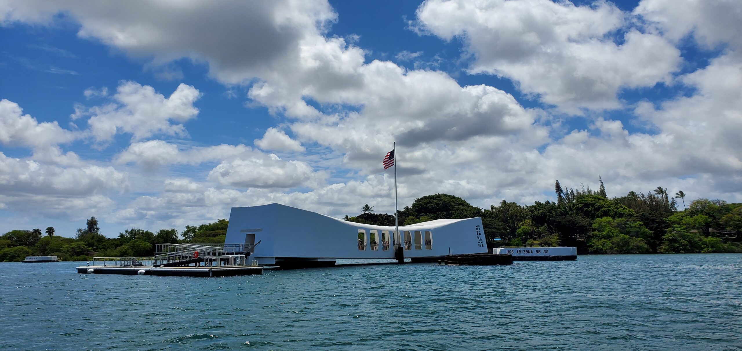 On May 30, 1962, a memorial was dedicated above the Arizona‘s wreck to mark the resting place of the 1,102 sailors and Marines whose bodies were not recovered and remain interred aboard. Accessible only by boat, the memorial straddles the ship’s hull without touching it. As a gravesite, Arizona is allowed to rest untouched. In fact, oil leaking from the ship can still be seen pooling on the water’s surface. USS Arizona was declared a National Historic Landmark on May 5, 1989.