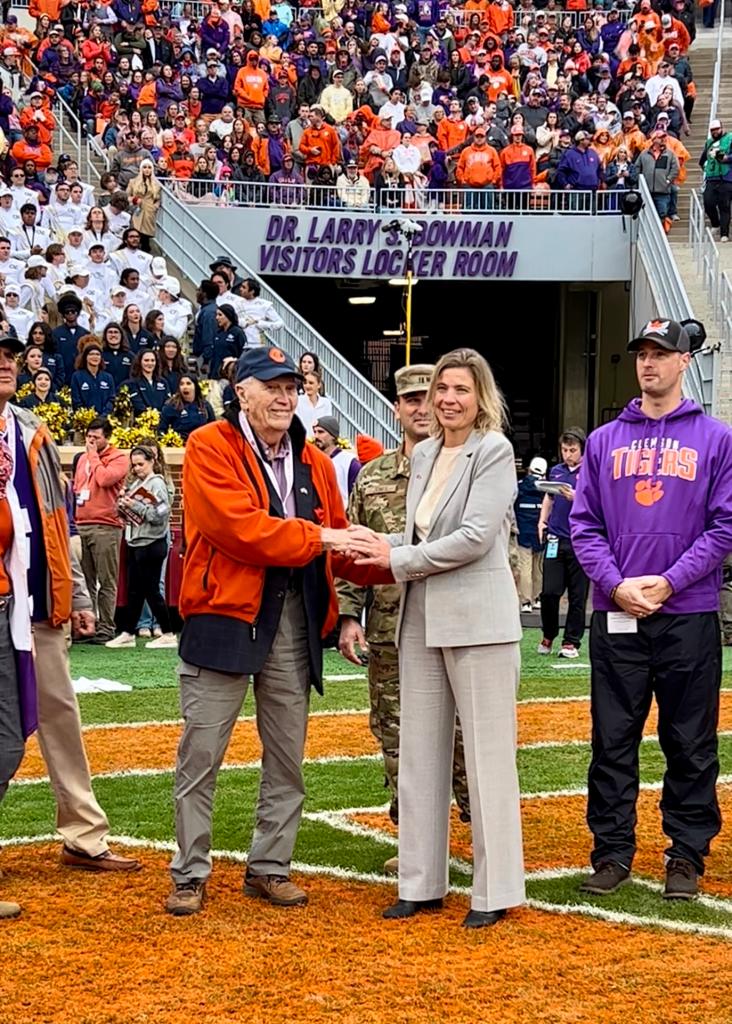 On November 11, 2023, during the Clemson Military Appreciation game against Georgia Tech and on Veterans Day, Capt. Jones was awarded the French Legion of Honor. The medal was presented at Clemson Memorial Stadium by Consul General of France Anne-Laure Desjonquères in front of a crowd of 81,500 people. “I was deeply honored to bestow the Legion of Honor to WWII veteran Capt. Joe Jones on #VeteransDay2023 ,” Desjonquères tweeted. “France pays tribute to the heroes who risked their lives for our freedom.” Meanwhile, Jones used the occasion to pay tribute to 52 comrades who made the ultimate sacrifice during WWII and for the nation to never forget the high price of freedom.