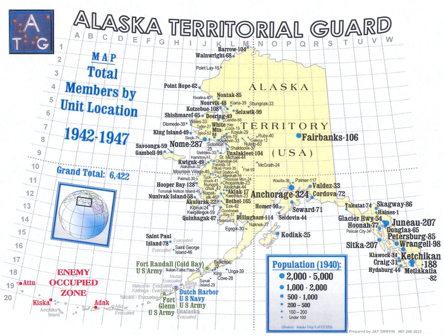 In the run-up to World War II, U.S. military planners failed to understand the serious threat to the Aleutian Islands and the Alaska mainland posed by Imperial Japan, and in August 1941, Alaska National Guard units were pulled out of Alaska and redeployed to Washington State, just four months prior to the Imperial Japanese attack on Pearl Harbor, Hawaii. When Japanese armed forces invaded and occupied parts of Alaska’s Aleutians Islands in 1942, the Army called on native Alaskan volunteers to defend the northern territory. More than 6,300 of these Alaskans, from the native Aleut, Athabaskan, White, Inupiaq, Haida, Tlingit, Tsimshian and Yupik peoples, volunteered for a newly created Alaska Territorial Guard (ATG), also called the Eskimo Scouts.