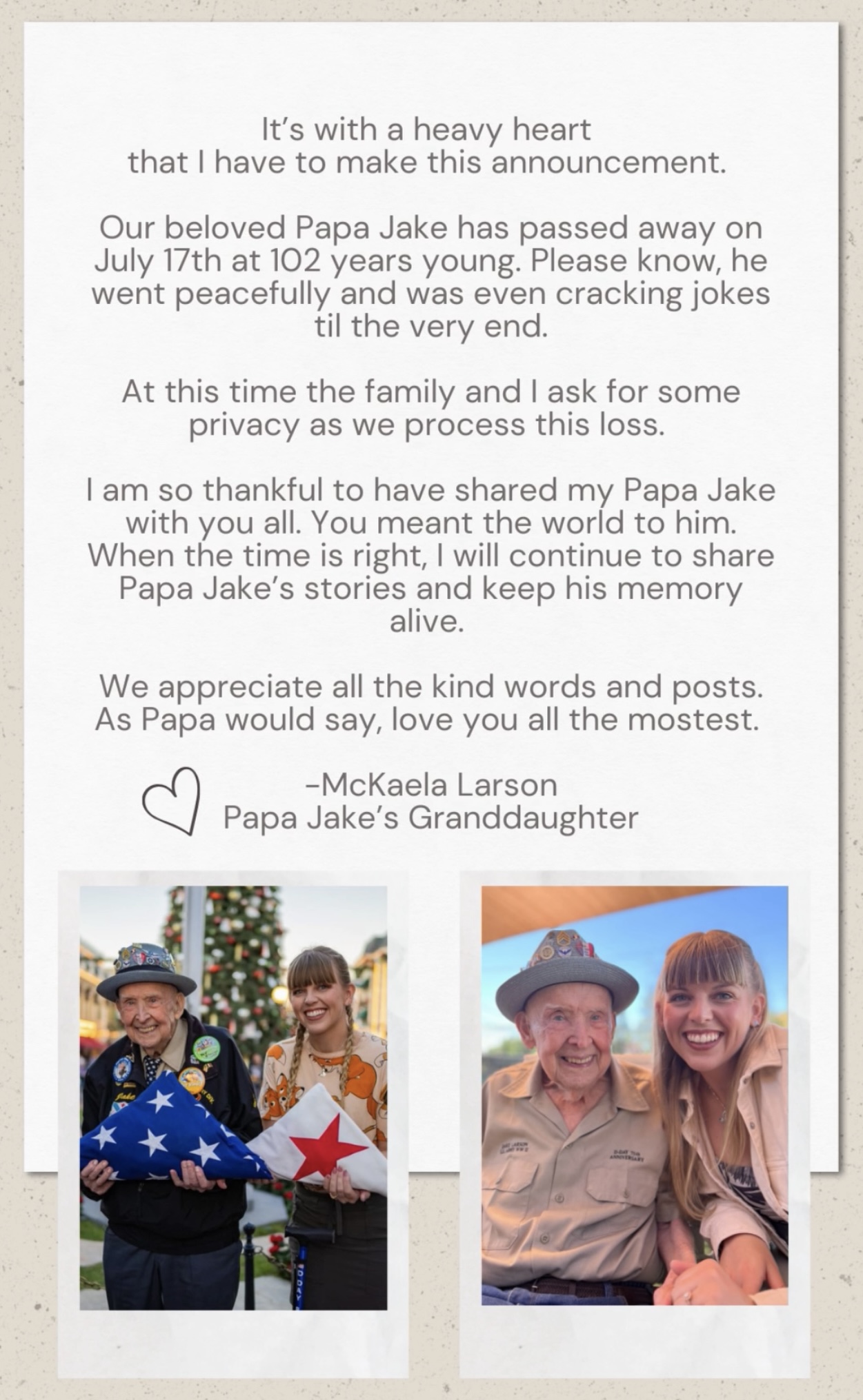 As a D-Day survivor, Larson returned to Normandy for the 75th, 79th, 80th, and 81st anniversaries of the invasion. Papa Jake’s TikTok also includes family moments; notably, Papa Jake walking granddaughter McKaela down the aisle at her wedding and dancing with her at the reception.