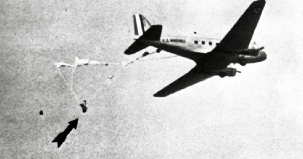 It was 9:30 in the morning May 15, 1941 when Osipoff, a member of the first group to go through the new Marine parachute school in Lakehurst, New Jersey, was jumpmaster on a training flight. He successfully launched his eleven jumpers, jettisoned a cargo pack, and was attempting to jettison a second when the ripcord of his parachute became entangled with the cargo pack’s ripcord. His parachute opened and dragged him out of the plane along with the cargo pack, leaving him dangling, head-down, 100 feet beneath the transport, which was flying at 800 feet.