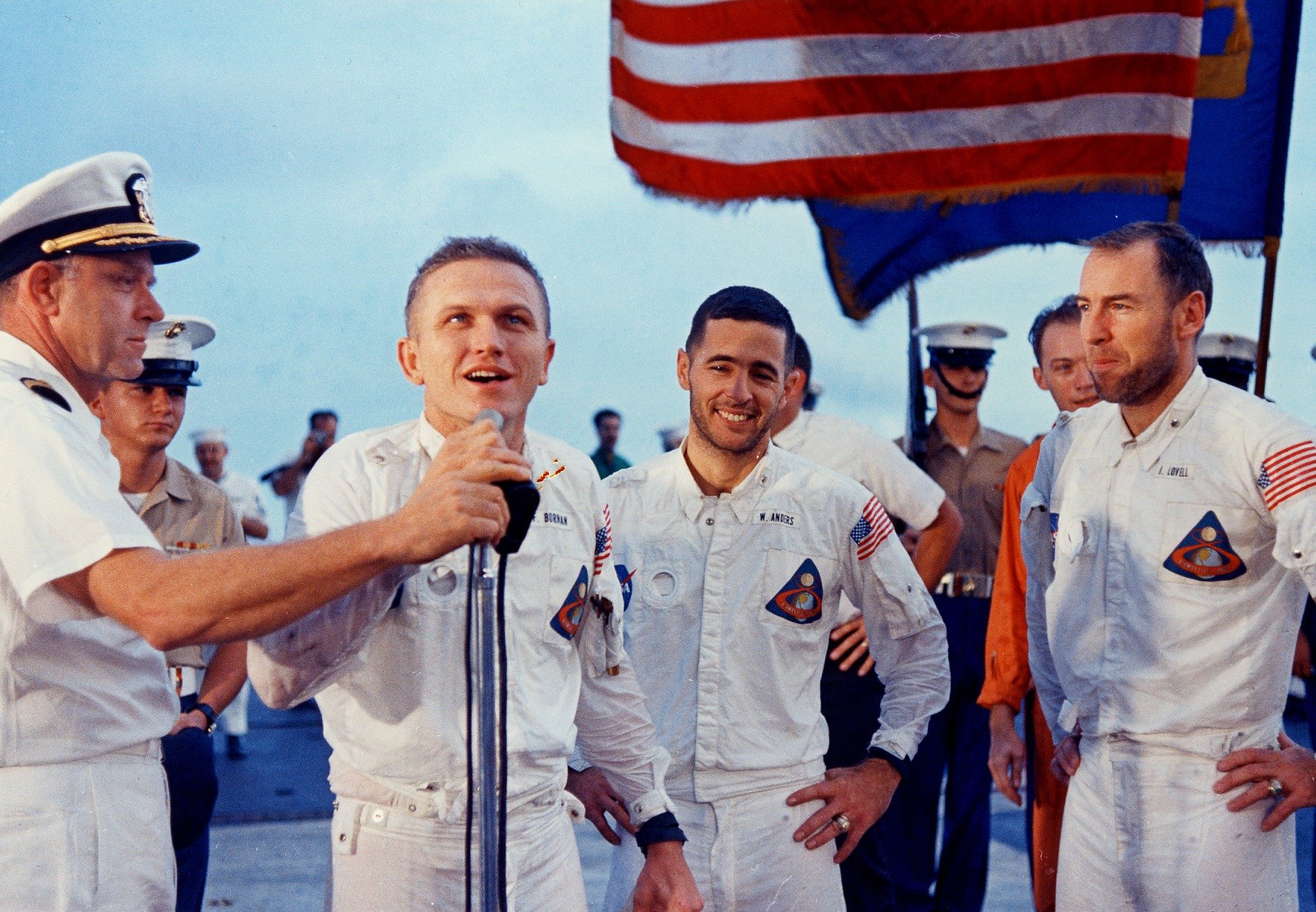 On November 20, 1967, the crew of Apollo 8 was announced with Borman as Commander, Michael Collins as Command Module Pilot, and William Anders as Lunar Module Pilot. However, Collins suffered a disc herniation in July 1968 and was replaced by Jim Lovell. On December 21, 1958, Apollo 8 launched. Despite Borman suffering a brief bout of vomiting and diarrhea, now believed to be space adaptation syndrome, Apollo 8 successfully entered lunar orbit on December 24. In 20 hours, the three men made 10 historic orbits of the Moon before returning to Earth on December 27. Borman, Lovell, and Anders received NASA Distinguished Service Medals for the mission. Borman also received the Air Force Distinguished Service Medal.