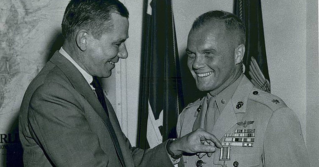 After Pearl Harbor, Glenn first tried to sign up with the Army Air Force – but instead ended up as a Naval Aviation Cadet. He transitioned to the Marine Corps, though, and was sent to the South Pacific.