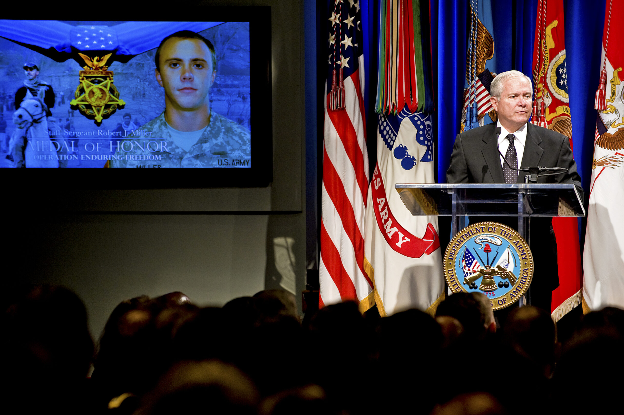 While maneuvering to engage the enemy, Staff Sergeant Miller was shot in his upper torso. Ignoring the wound, he continued to push the fight, moving to draw fire from over one hundred enemy fighters upon himself. He then again charged forward through an open area in order to allow his teammates to safely reach cover. After killing at least 10 insurgents, wounding dozens more, and repeatedly exposing himself to withering enemy fire while moving from position to position, Staff Sergeant Miller was mortally wounded by enemy fire. His extraordinary valor ultimately saved the lives of seven members of his own team and 15 Afghanistan National Army soldiers. Staff Sergeant Miller’s heroism and selflessness above and beyond the call of duty, and at the cost of his own life, are in keeping with the highest traditions of military service and reflect great credit upon himself and the United States Army.