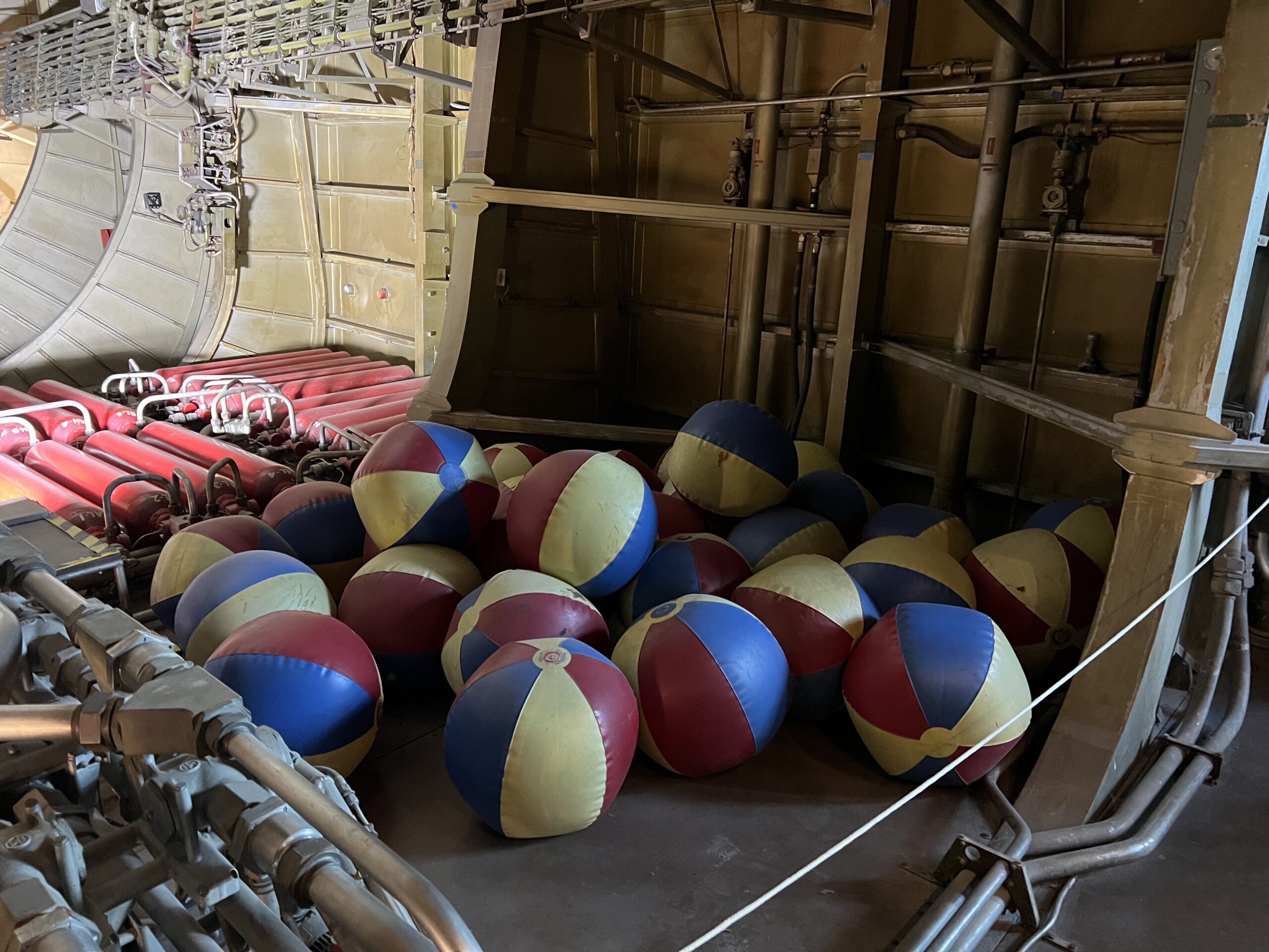 As a flying boat, the Hercules had a hollow lower hull and wing floats that allowed it to takeoff and land on the water. Still, Hughes feared that the aircraft could sink in the event of an accident. To address this, he had the H-4’s original clamshell cargo nose doors replaced with a solid nose. Additionally, Hughes had the lower hull and wing floats filled with inflated rubber bladders and beach balls for insurance buoyancy. The beach balls were left inside the wing floats and not discovered until the Hercules’ reassembly at the Evergreen Museum in 2001.