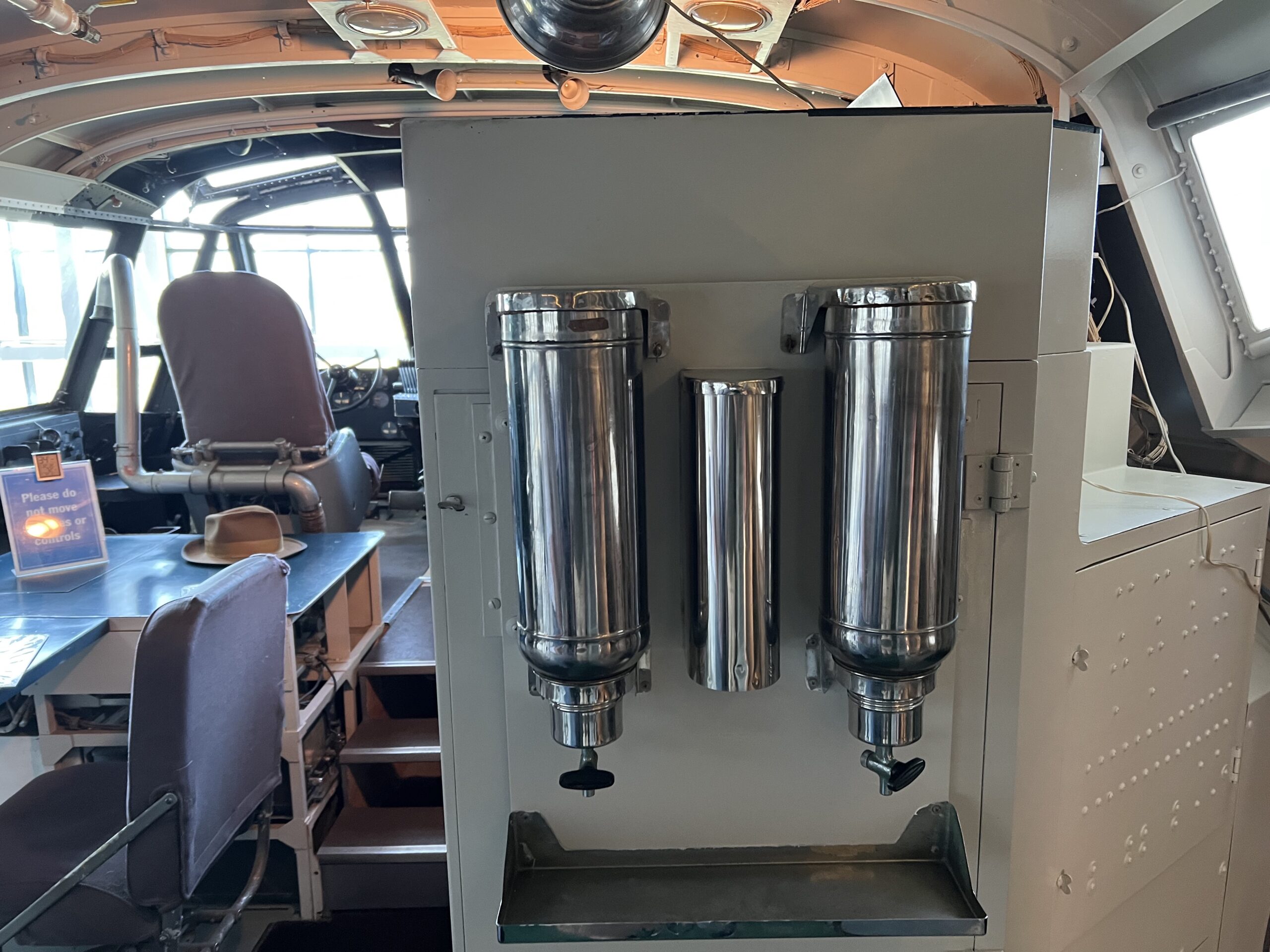 For the long flight across the Atlantic, the Hercules was equipped with coffee stations on both the cargo deck and the flight deck above. There was also a central air conditioning unit to keep passengers comfortable. Hughes, however, had an individual air conditioning duct run from the central unit directly to the pilot’s position in the cockpit. Similarly, he insisted that controls for all eight engines be placed in the cockpit and not at the engineering station.