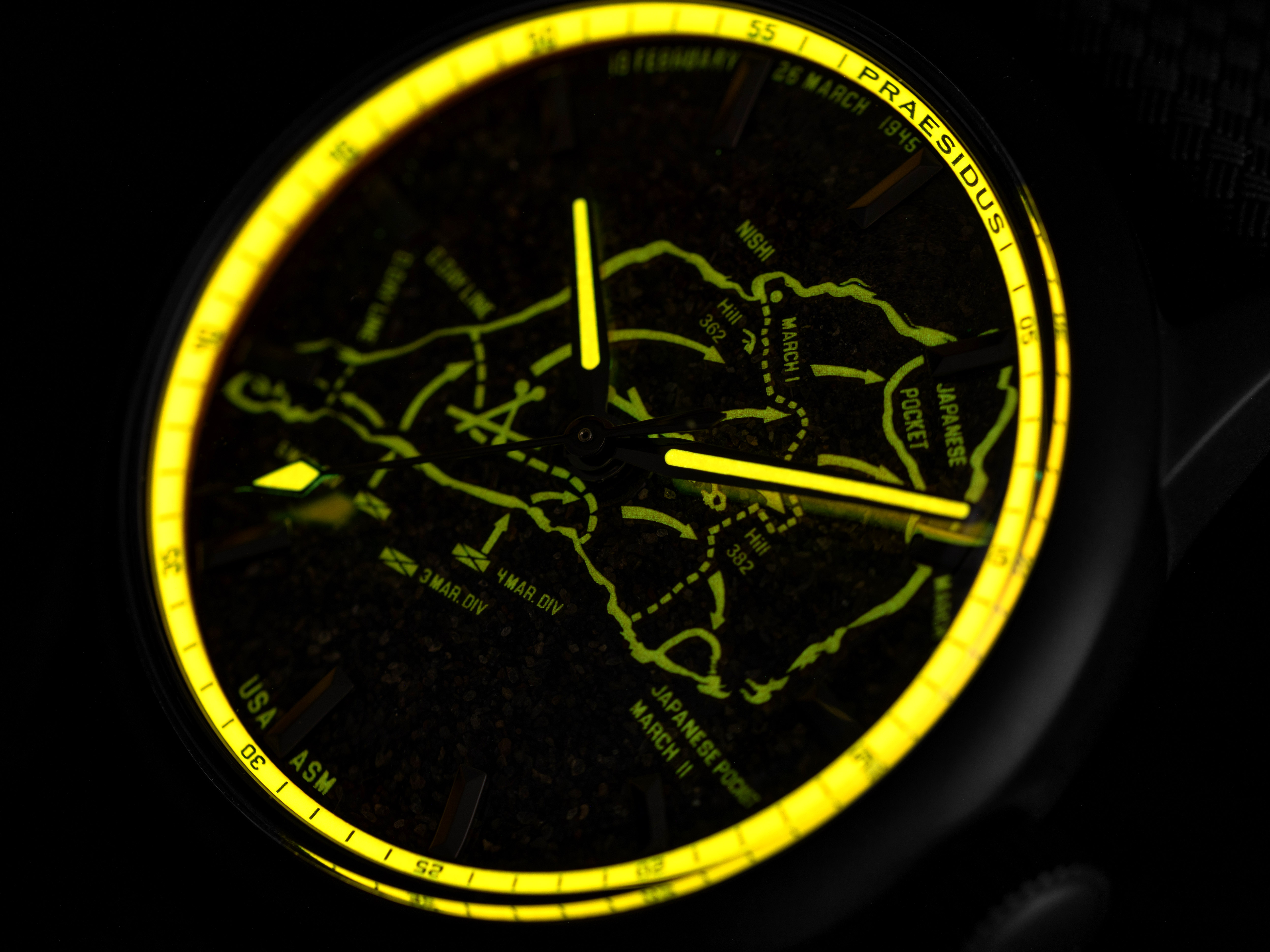 In 2024, Praesidus honored the 80th anniversary of the D-Day landings in Normandy, France with a line of commemorative watches containing sand from Utah Beach or a piece of metal from a D-Day C-47 Skytrain. The Iwo Jima A-11 watches build the collection with a shift in focus to the Pacific theater. To obtain the infamous black sand from the sulfur island, Praesidus worked with a Marine who collected the sand during a ceremonial visit to Iwo Jima. Inspired by the Marine’s generosity, Praesidus designed three watches to commemorate the battle and honor the Marines who served there with uncommon valor: the Pacific Memorial, Victory Sands Orange, and Victory Sands Cream.