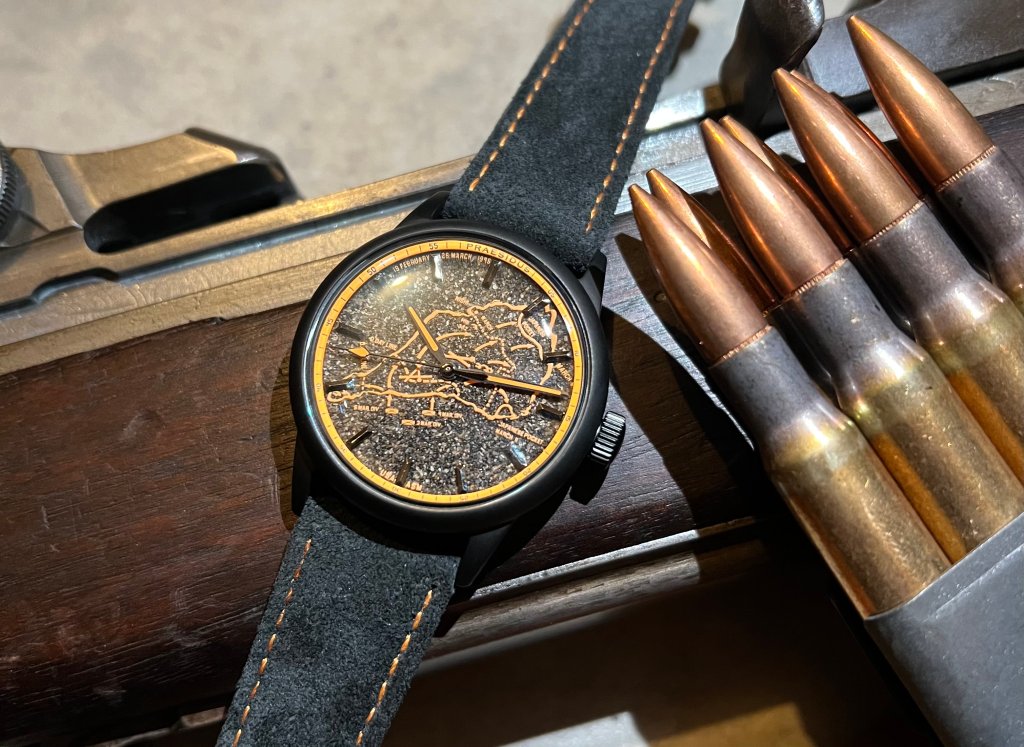 To honor the five-week Iwo Jima campaign, the Victory Sands models of the Iwo Jima A-11 depict a map of the island with the progress of the Marine Divisions from February into March 1945. The black sand dial beneath the map provides contrast to both the orange and cream variants and is clearly visible through a double-domed sapphire crystal like on the Pacific Memorial model. Unlike the Memorial model, the Victory Sands watches are powered by an American-built Ameriquartz 6130 movement. While not as refined in horological terms, the quartz movement is certainly more accurate. More importantly, Praesidus notes that the 6130 was “a conscious choice given the nature of the project & our mission to help revive the once thriving American Watchmaking Industry.” The orange variant features orange lume while the cream variant features green lume. Both Victory Sands watches can be had on a rubber or leather strap and are priced at $320.