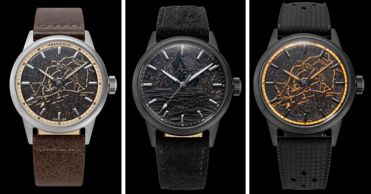 In 2024, Praesidus honored the 80th anniversary of the D-Day landings in Normandy, France with a line of commemorative watches containing sand from Utah Beach or a piece of metal from a D-Day C-47 Skytrain. The Iwo Jima A-11 watches build the collection with a shift in focus to the Pacific theater. To obtain the infamous black sand from the sulfur island, Praesidus worked with a Marine who collected the sand during a ceremonial visit to Iwo Jima. Inspired by the Marine’s generosity, Praesidus designed three watches to commemorate the battle and honor the Marines who served there with uncommon valor: the Pacific Memorial, Victory Sands Orange, and Victory Sands Cream.