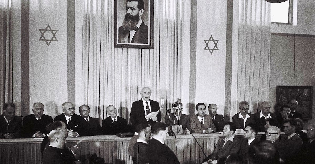 Featured Image: David Ben-Gurion (First Prime Minister of Israel) publicly pronouncing the Declaration of the State of Israel, May 14 1948, Tel Aviv, Israel, beneath a large portrait of Theodor Herzl, founder of modern political Zionism, in the old Tel Aviv Museum of Art building on Rothshild St. The exhibit hall and the scroll, which was not yet finished, were prepared by Otte Wallish.