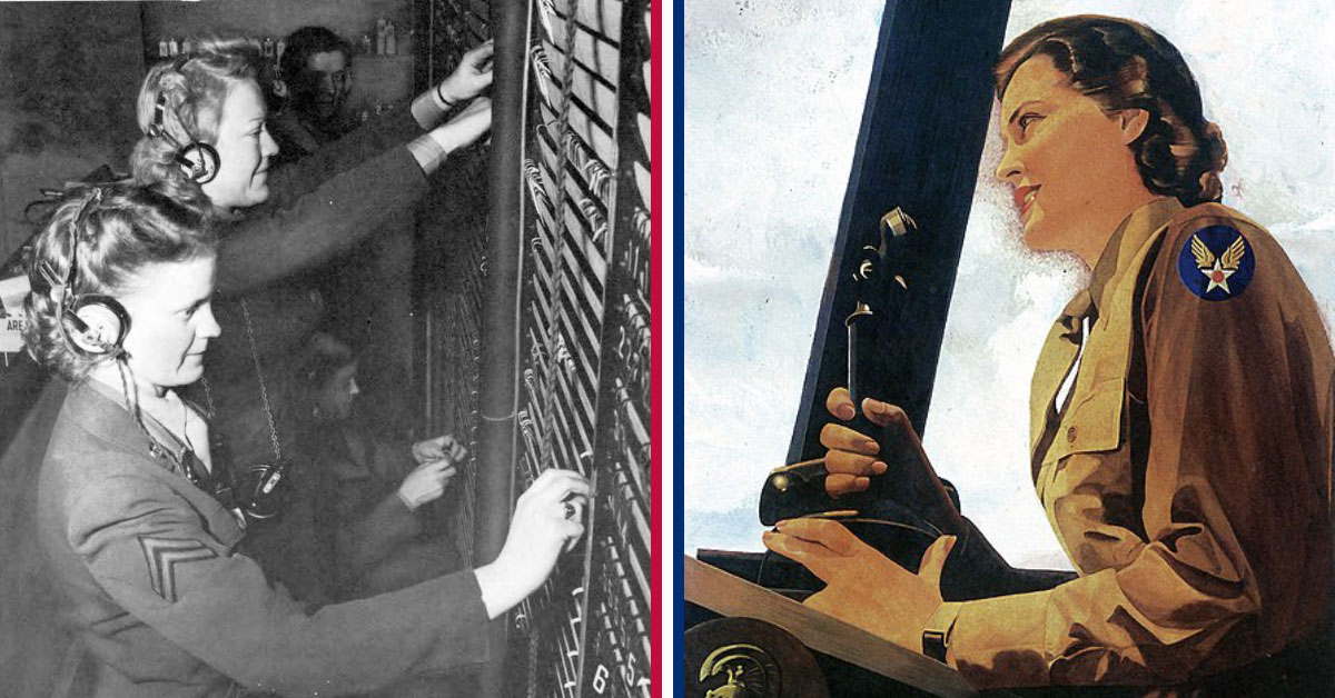 Featured Image: (Left) WACS working in the communications section of the operations room at an air force station. No opportunity was overlooked to replace men with personnel of the Women’s Army Corps both in the United States and overseas, WACs were given many technical and specialized jobs to do, as well as administrative and office work. The Medical Corps employed the largest number of WACs in technical jobs, but other technical services such as the Transportation Corps, Signal Corps, Ordnance Department, and Quartermaster Corps had many positions that could be performed by women as efficiently as by men. (Right) WAC Air Controller painting by Dan V. Smith, 1943